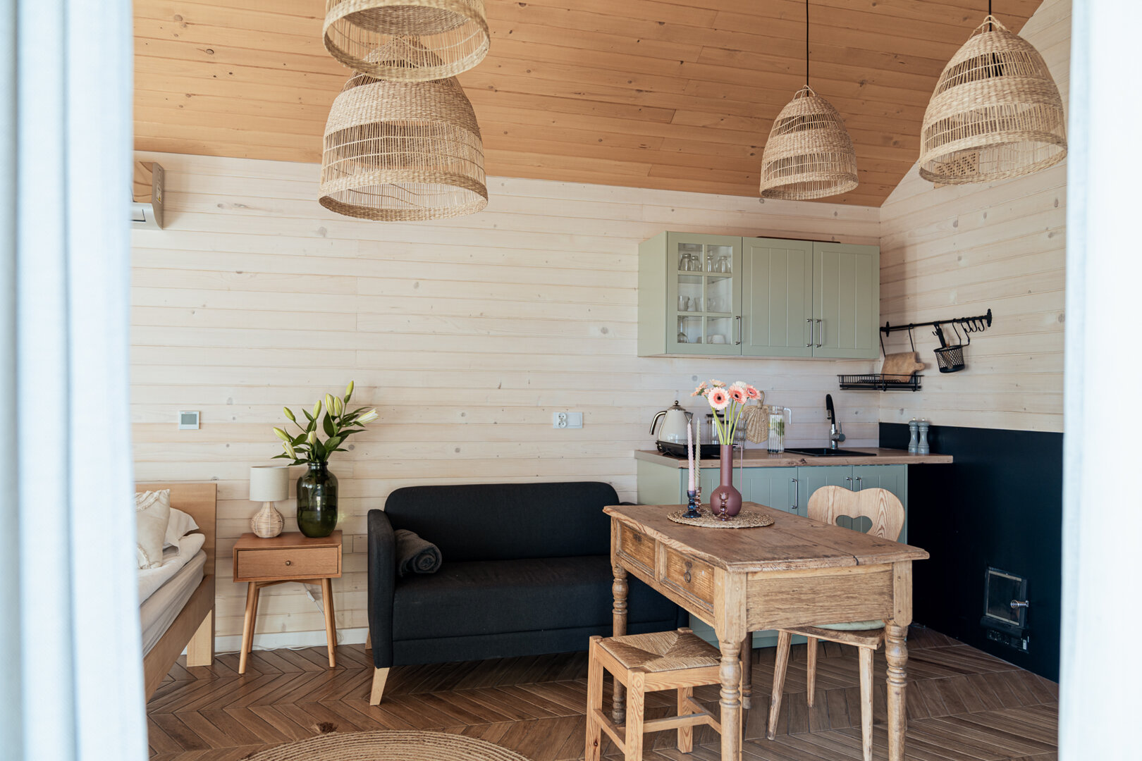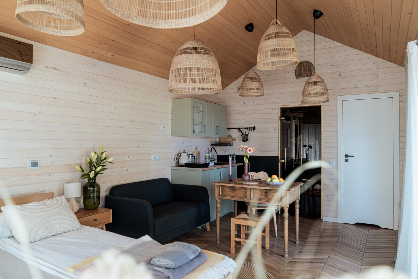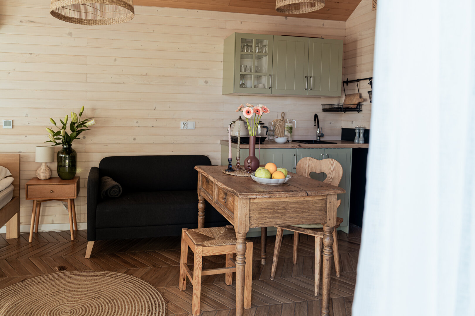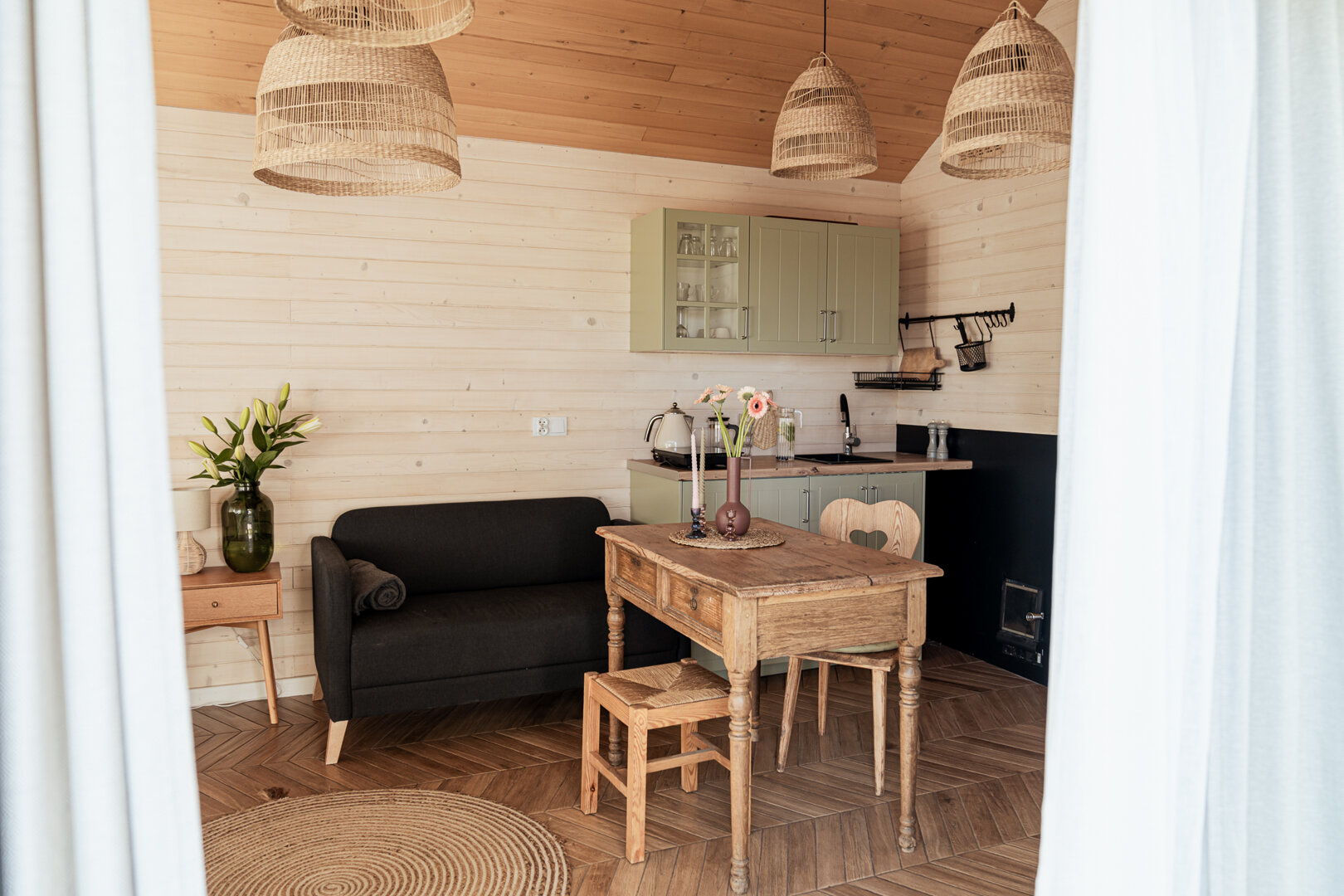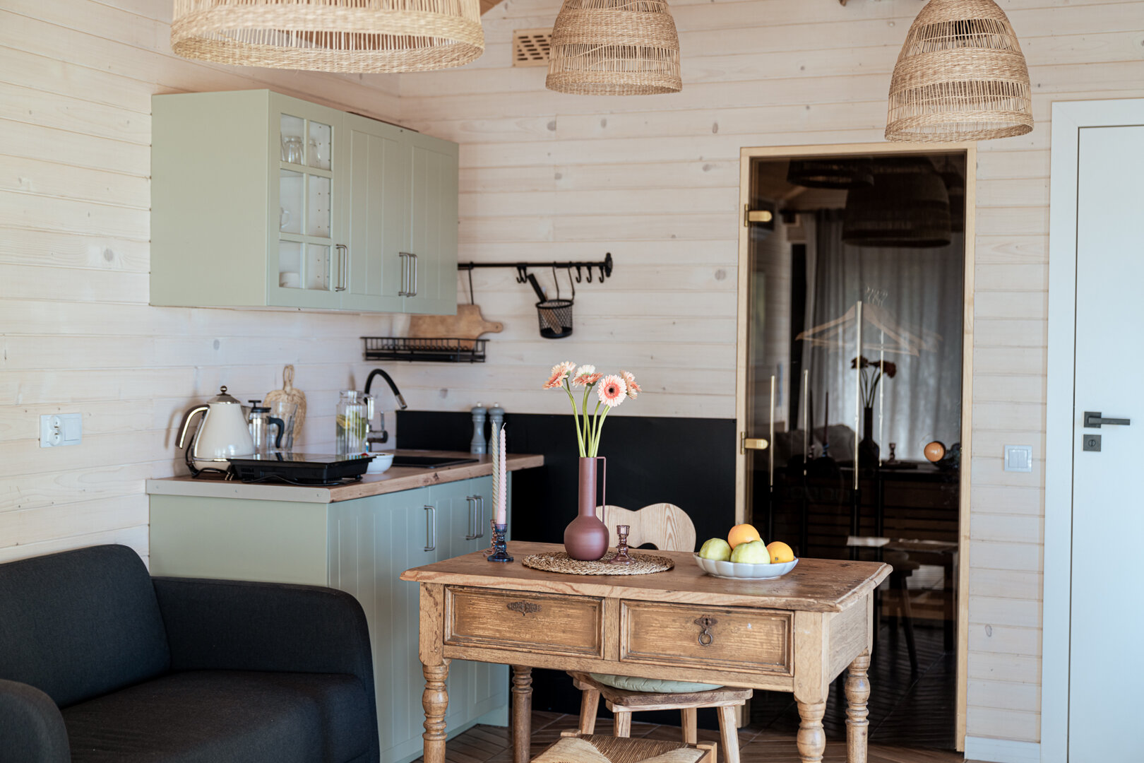 Domek wyposażony jest także w duże przeszklenia, które pozwolą poczuć bliskość natury, oraz aneks kuchenny zapewniający pełną wygodę podczas pobytu.