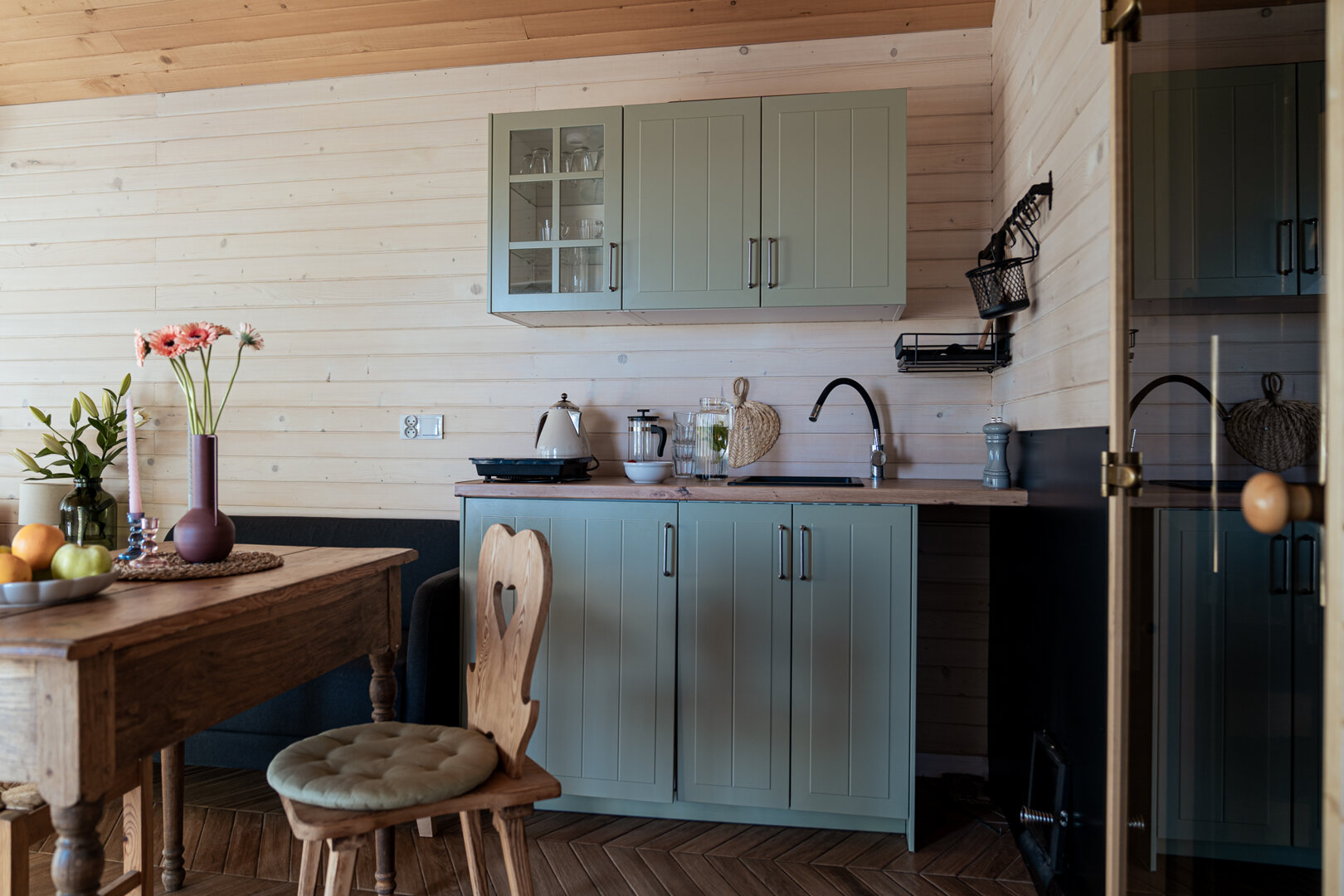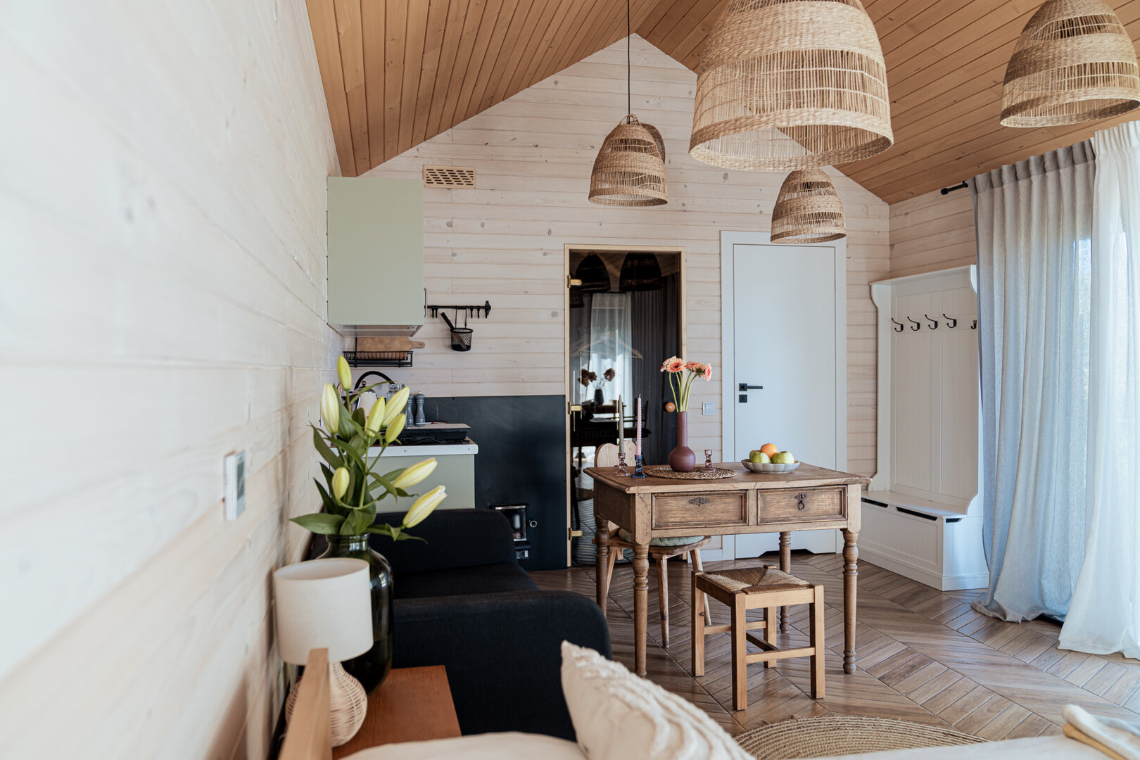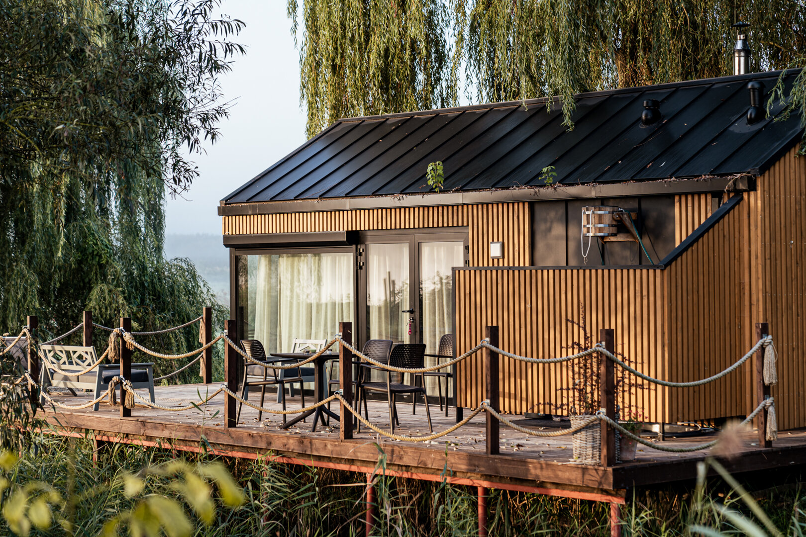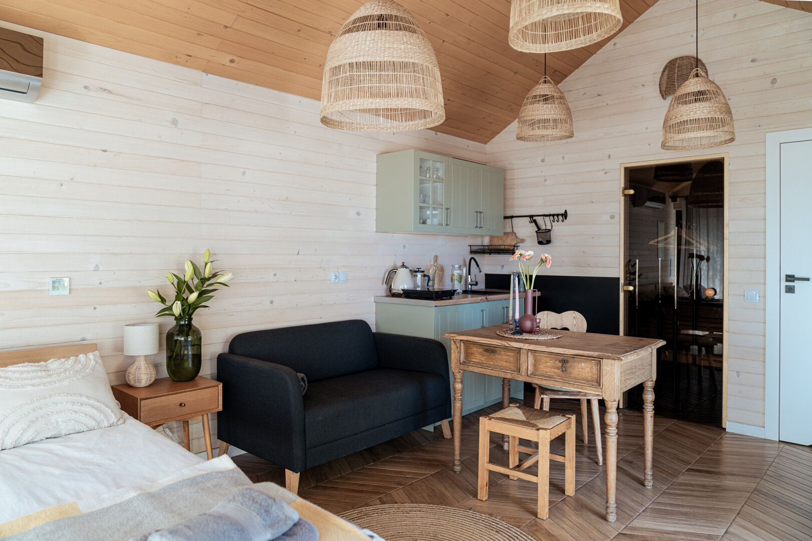 Domek wyposażony jest także w duże przeszklenia, które pozwolą poczuć bliskość natury, oraz aneks kuchenny zapewniający pełną wygodę podczas pobytu.