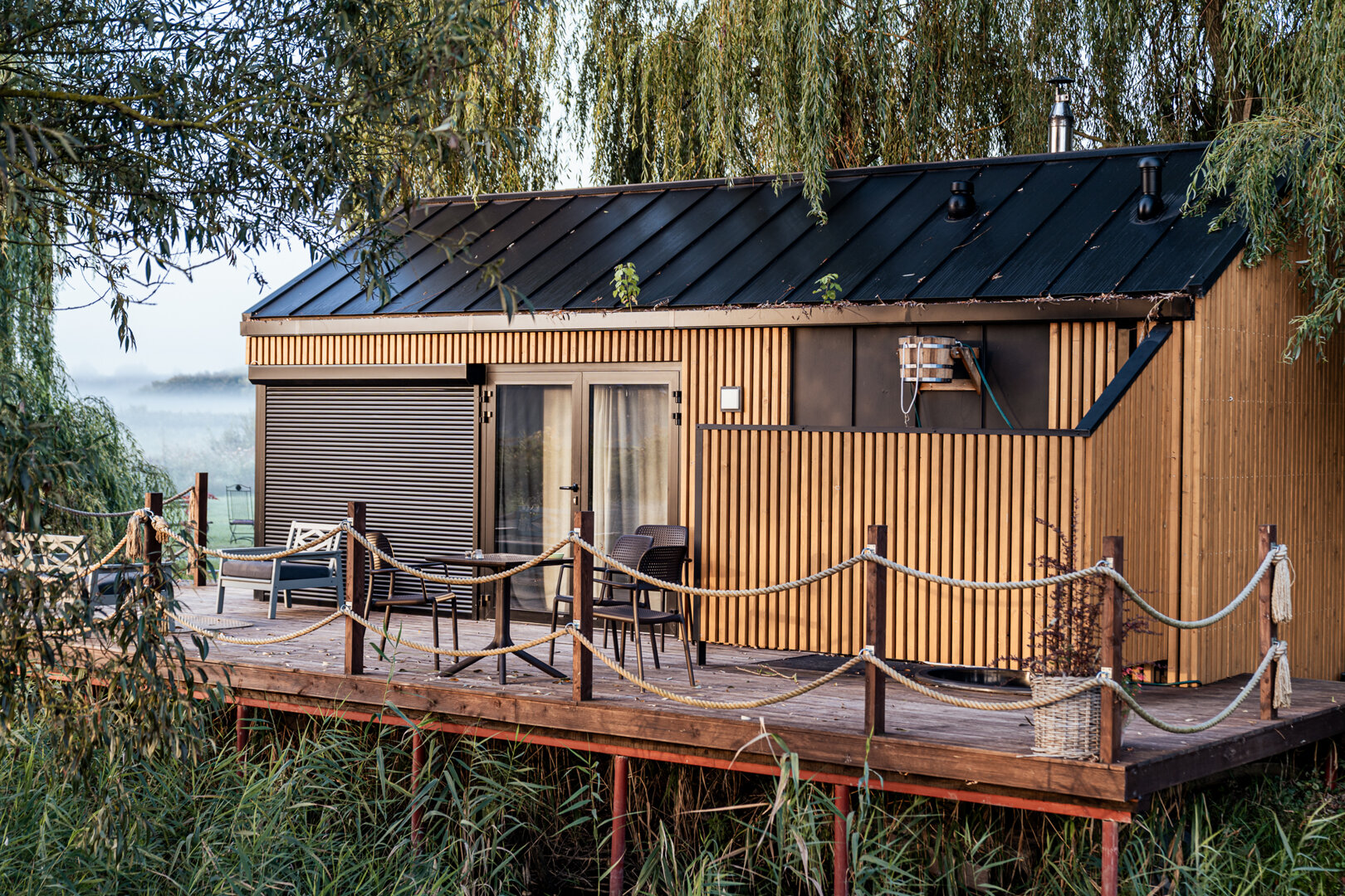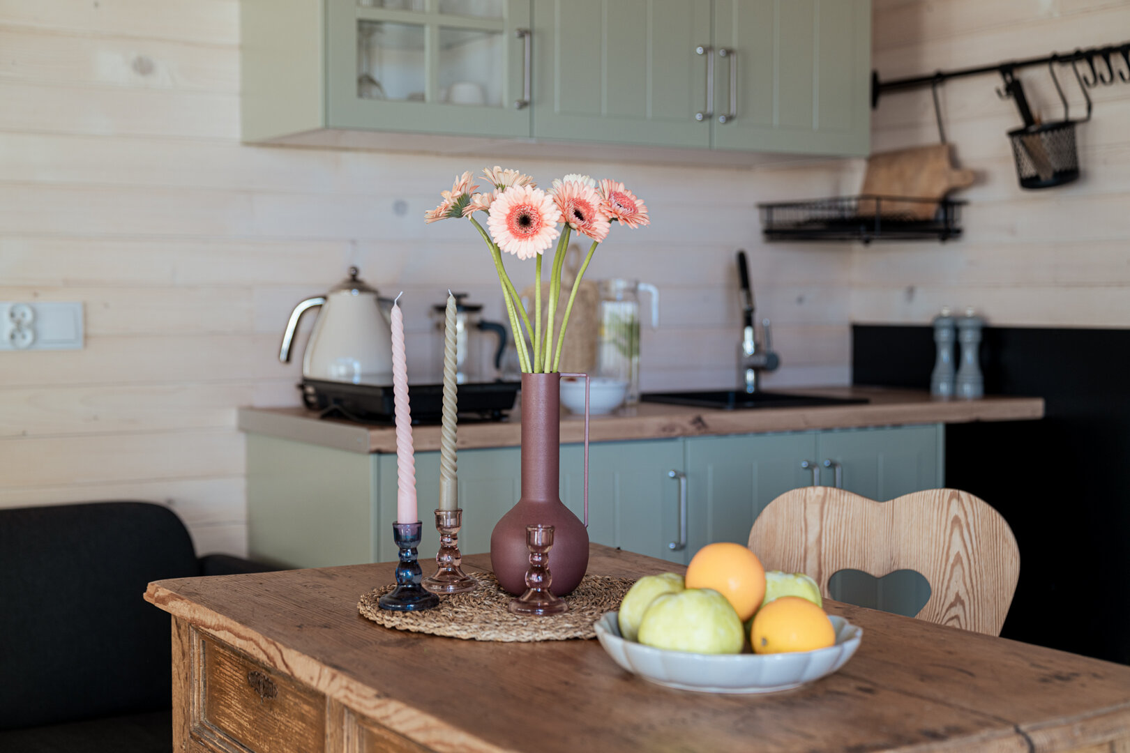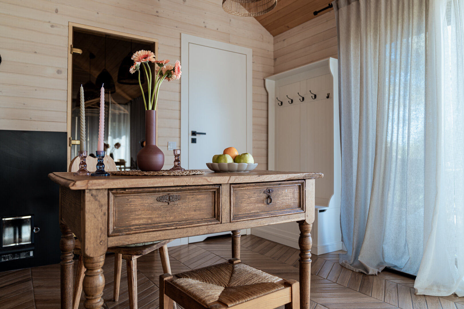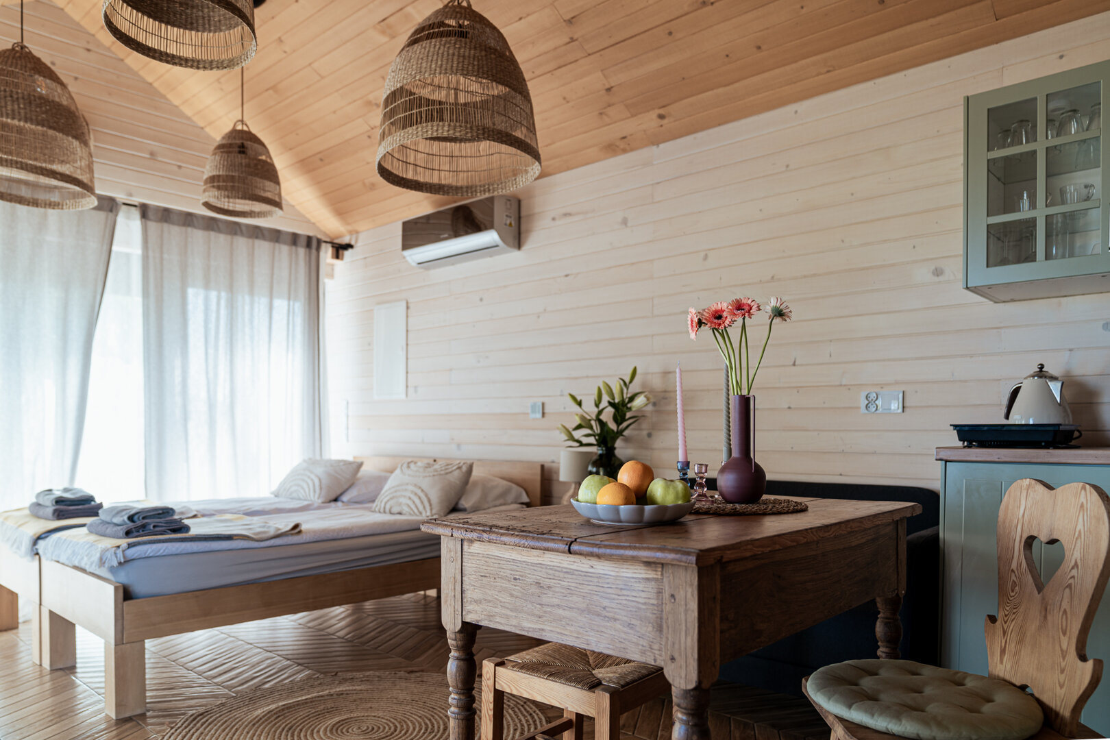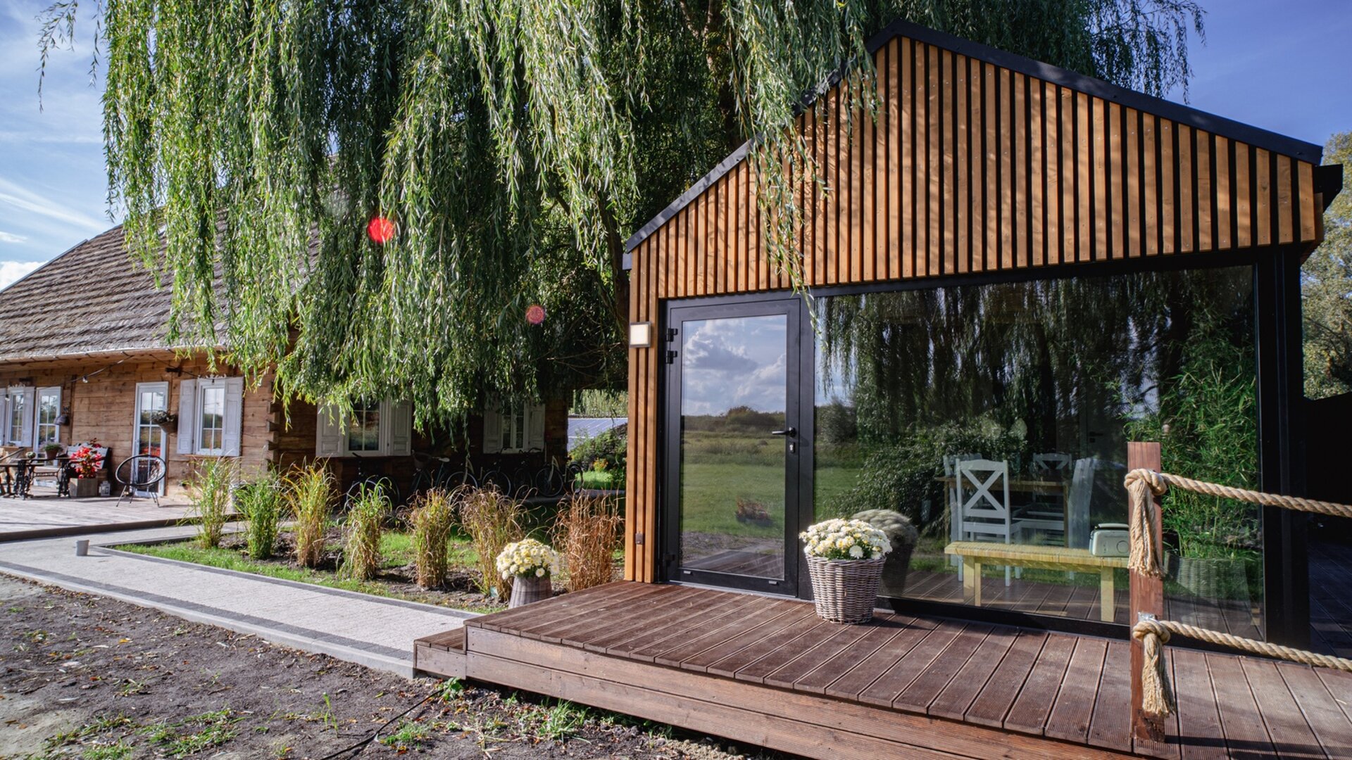 Domek wyposażony jest także w duże przeszklenia, które pozwolą poczuć bliskość natury, oraz aneks kuchenny zapewniający pełną wygodę podczas pobytu.