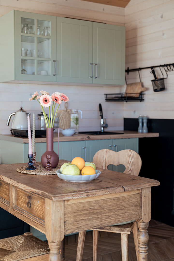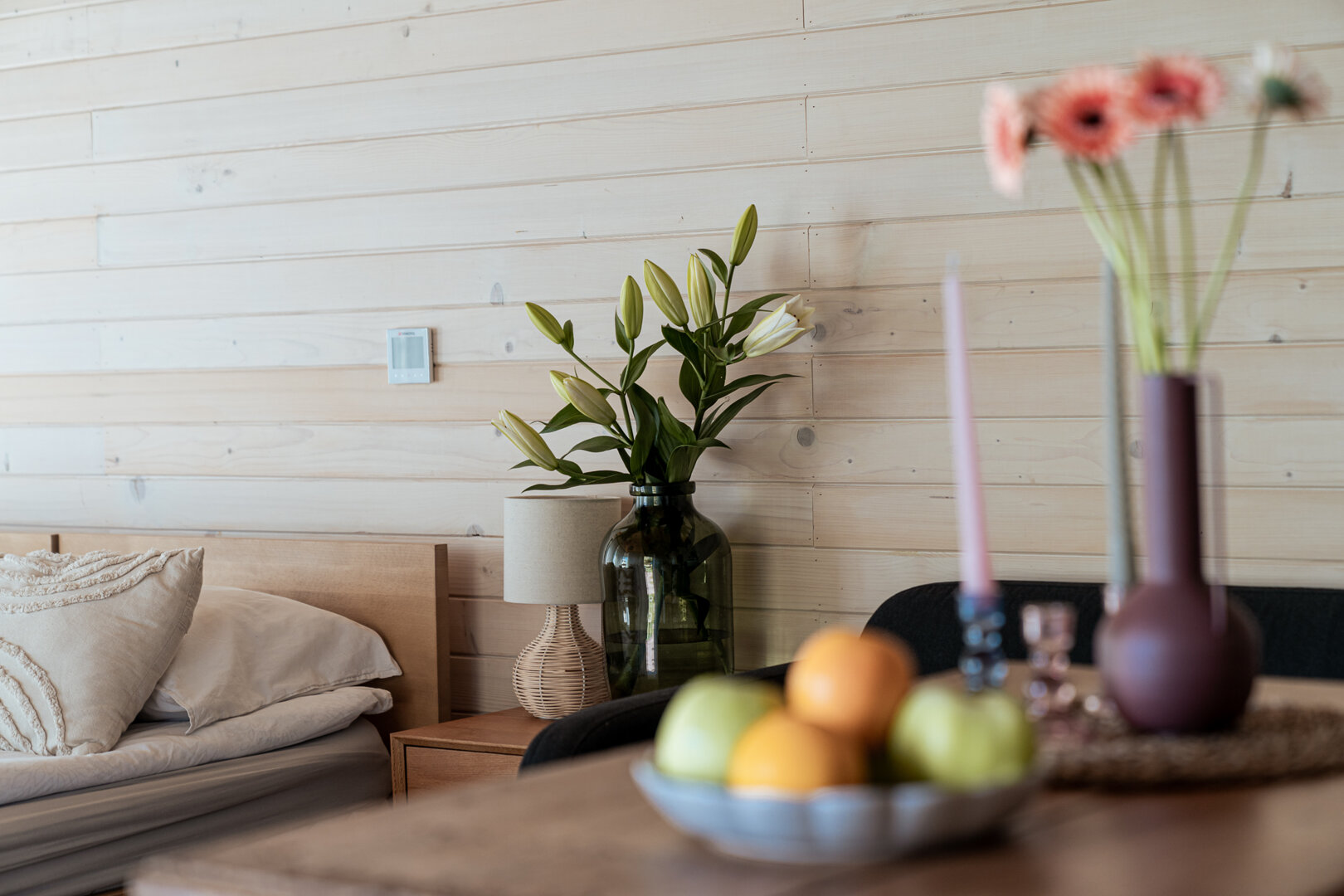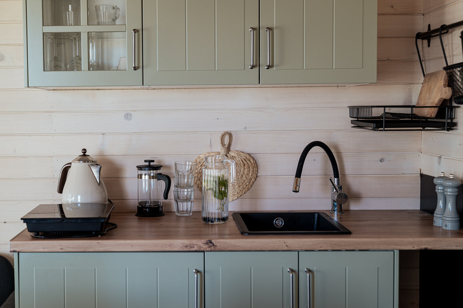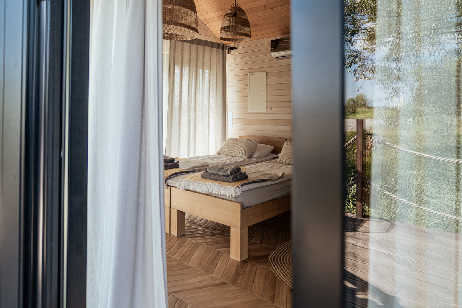 Domek wyposażony jest także w duże przeszklenia, które pozwolą poczuć bliskość natury, oraz aneks kuchenny zapewniający pełną wygodę podczas pobytu.