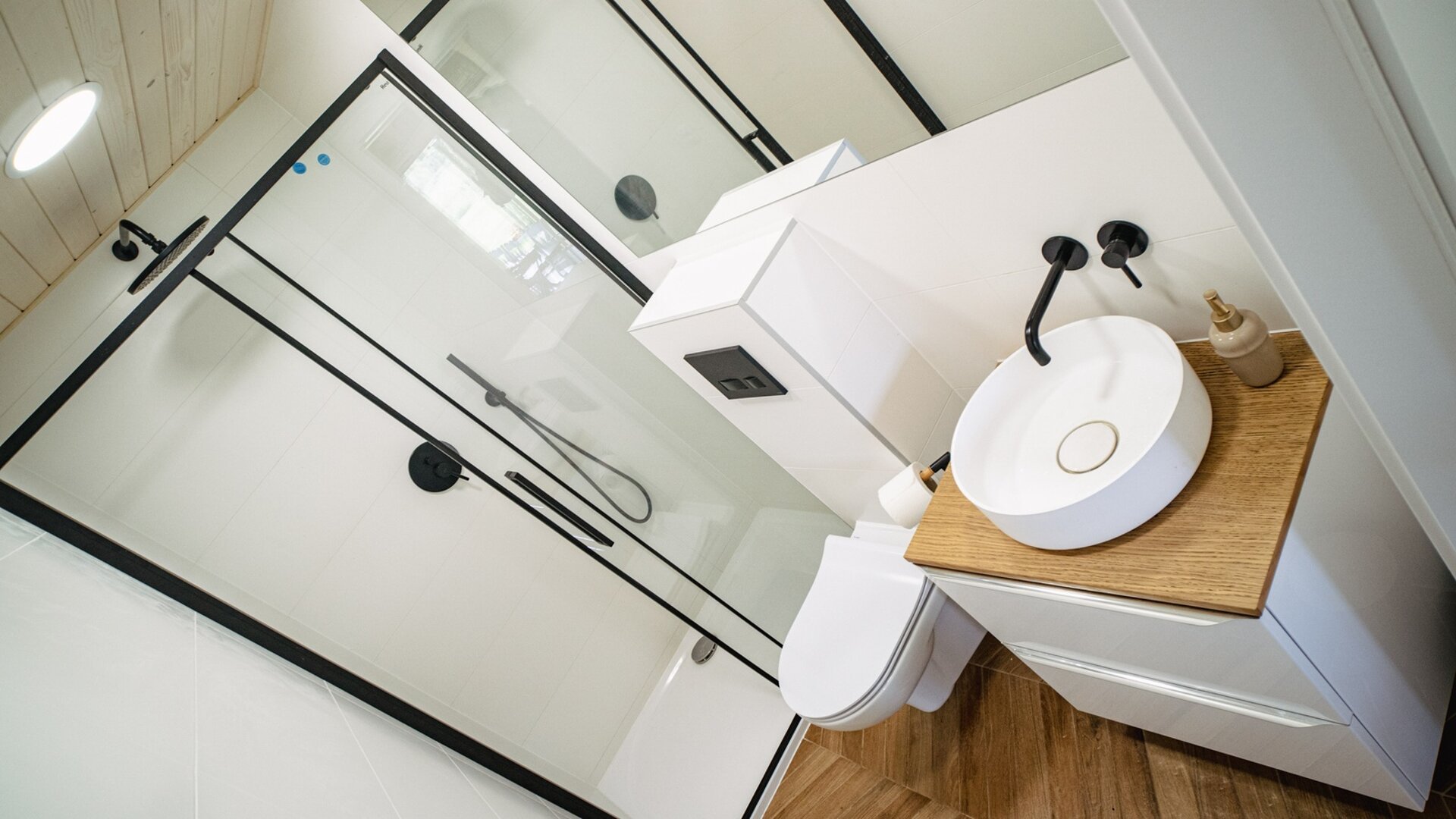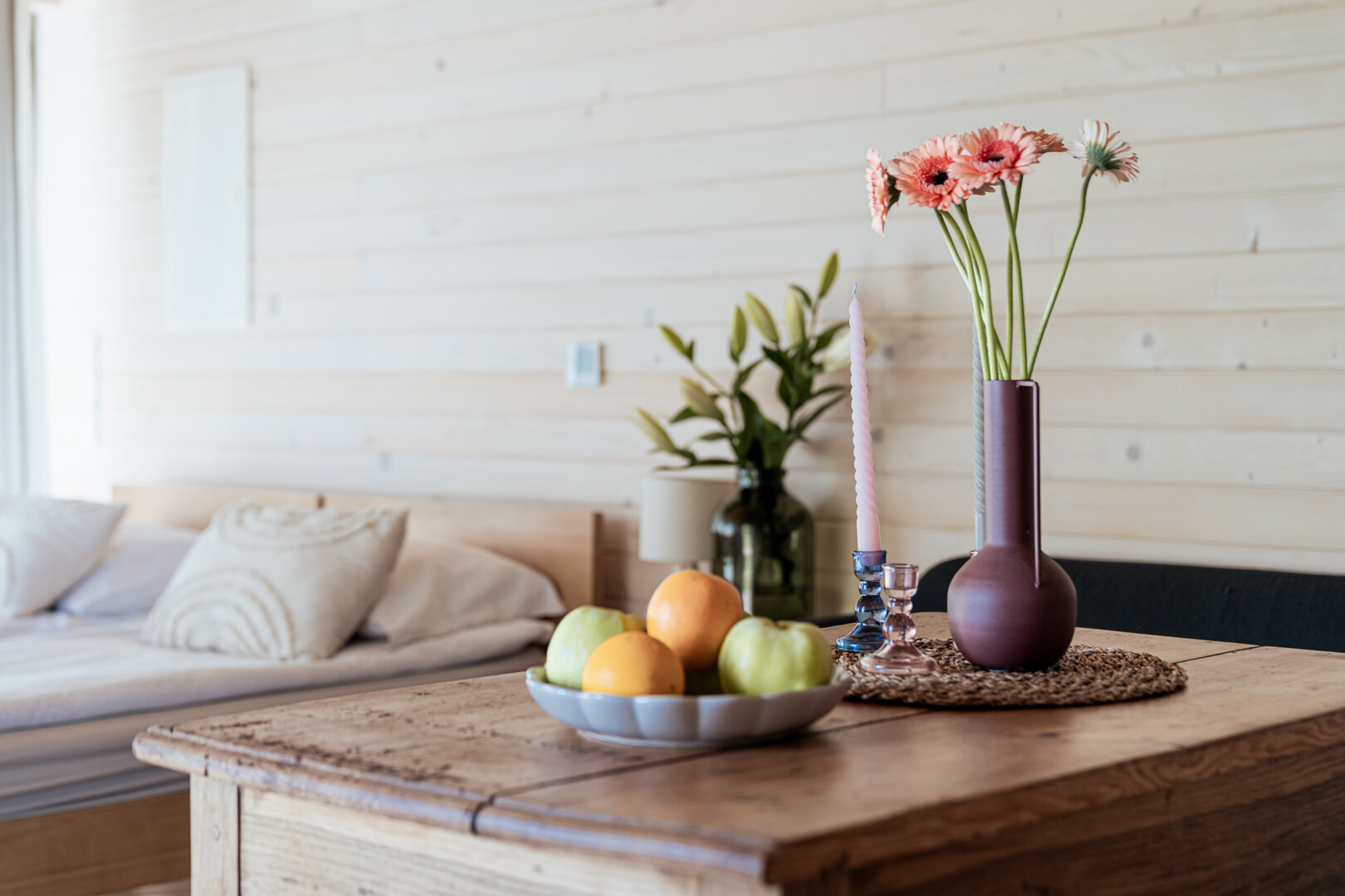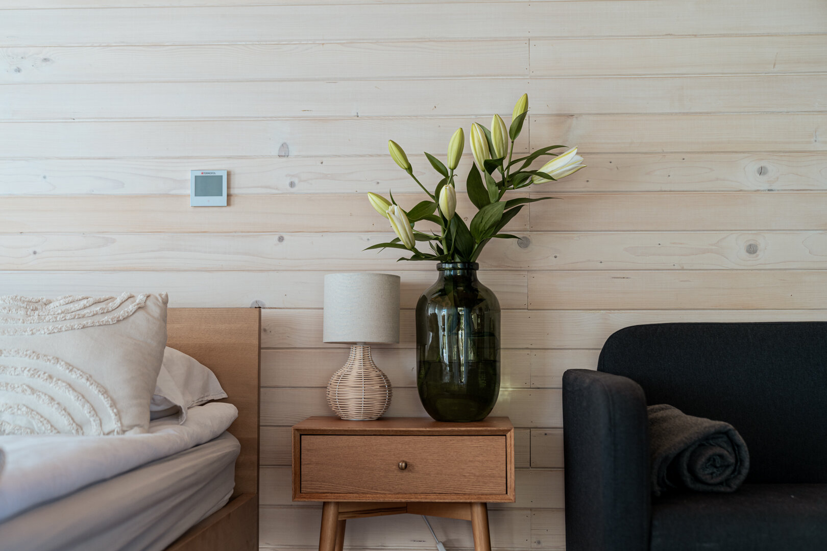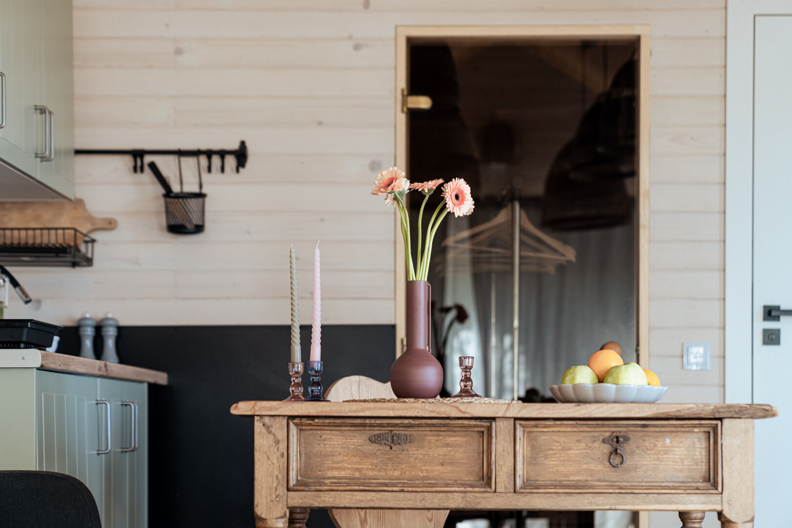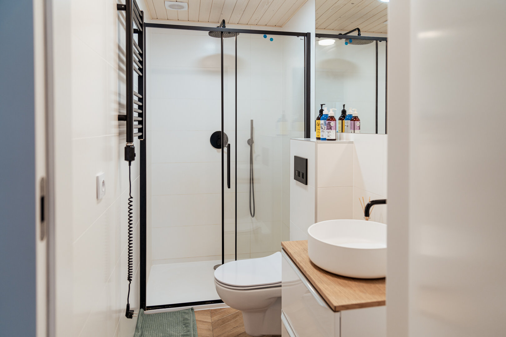 Domek wyposażony jest także w duże przeszklenia, które pozwolą poczuć bliskość natury, oraz aneks kuchenny zapewniający pełną wygodę podczas pobytu.