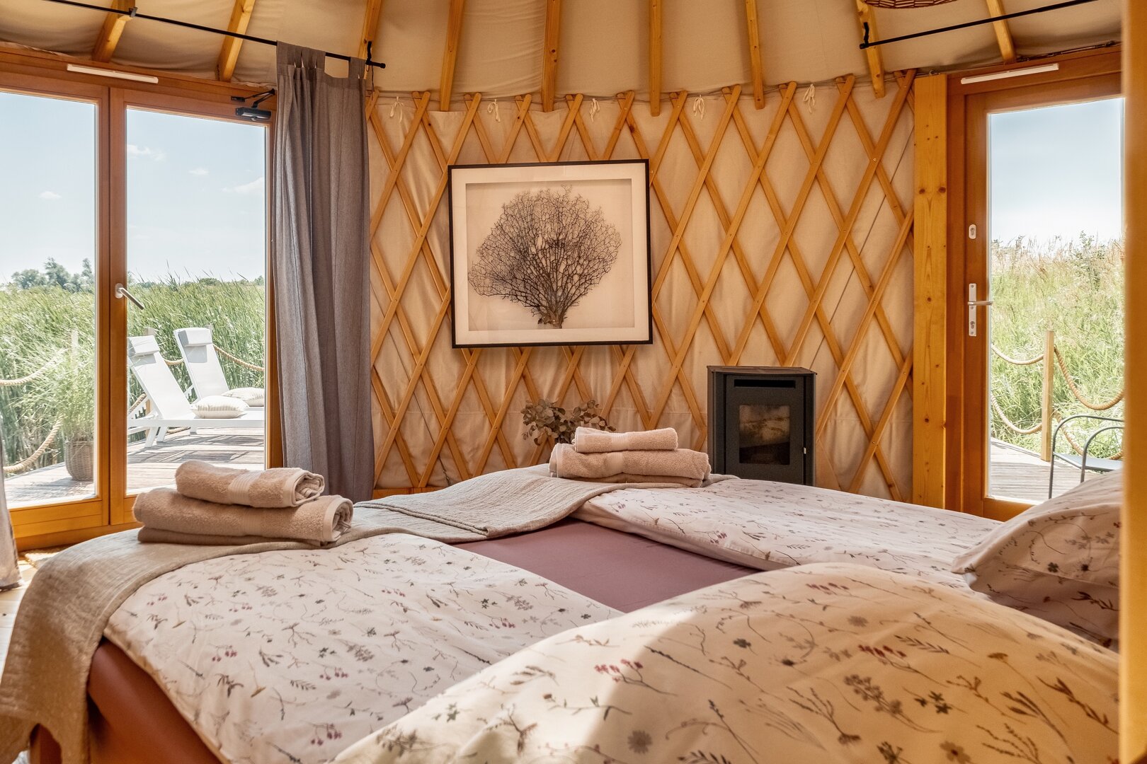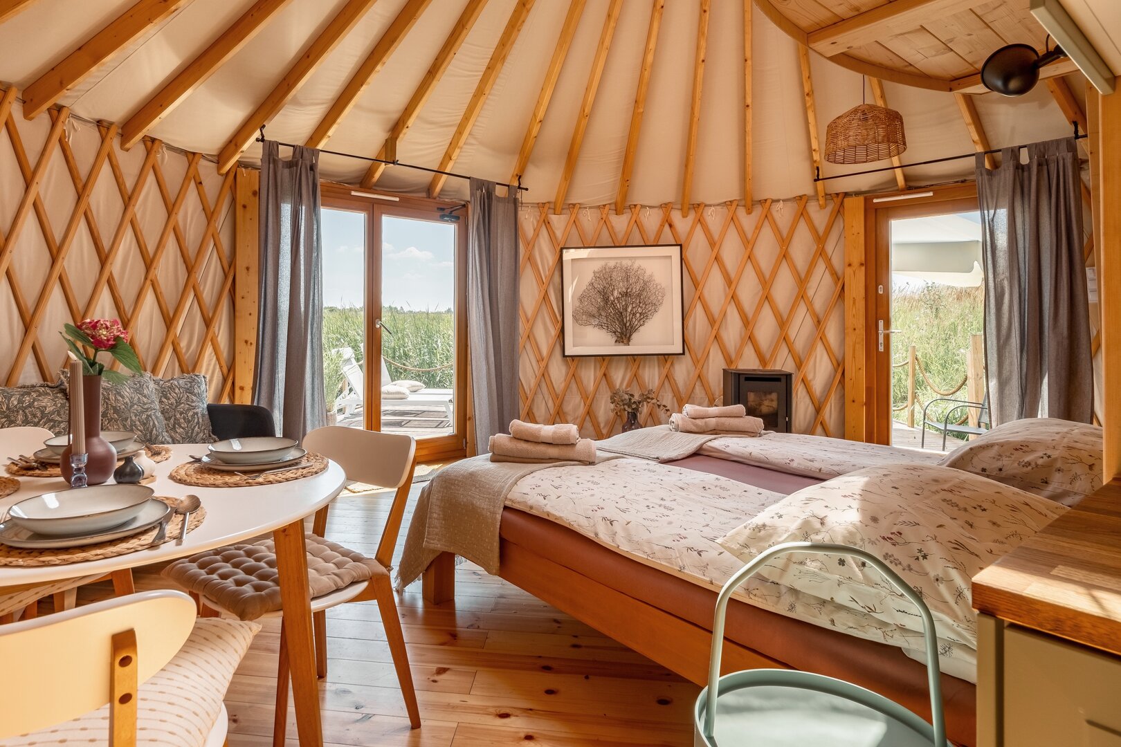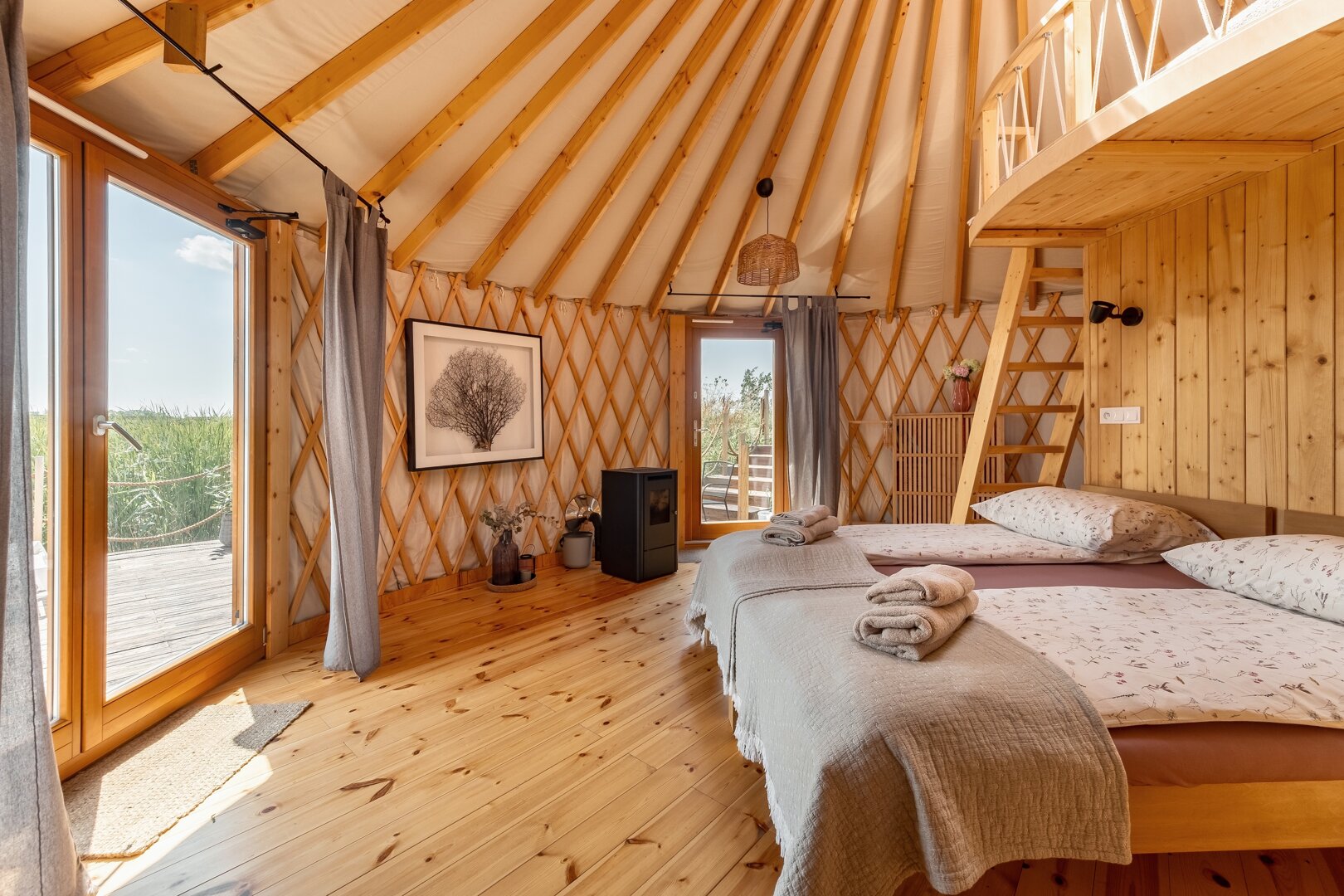 Witaj w naszej ekologicznej jurcie, usytuowanej nad lustrem wody na 4-hektarowym stawie. Z drewnianym wnętrzem i sferycznym oknem dachowym, będziesz budzić się z widokiem na staw, a nocą zasypiać, podziwiając gwiazdy. Taras przed jurtą to prawdziwy raj dla wędkarzy – karpie powyżej 20 kg czekają na Twoje zanęty! Odkryj spokój natury i magię tego wyjątkowego miejsca, w którym każdy moment będzie pełen relaksu i harmonii z otoczeniem.